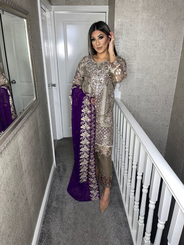3pc GREY Embroidered suit with purple chiffon dupatta Embroidered Stitched Suit Ready to wear UQ-GREYPURPLE