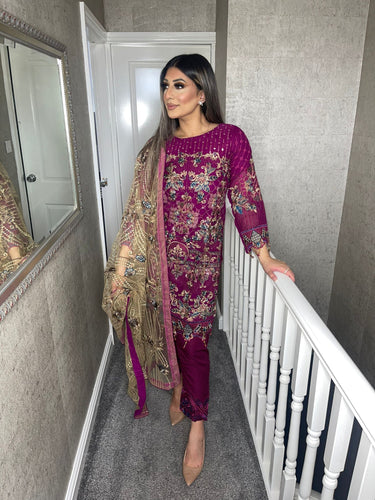 3pc Purple Embroidered Shalwar Kameez with Chiffon dupatta Stitched Suit Ready to wear HW-RMPURPLE